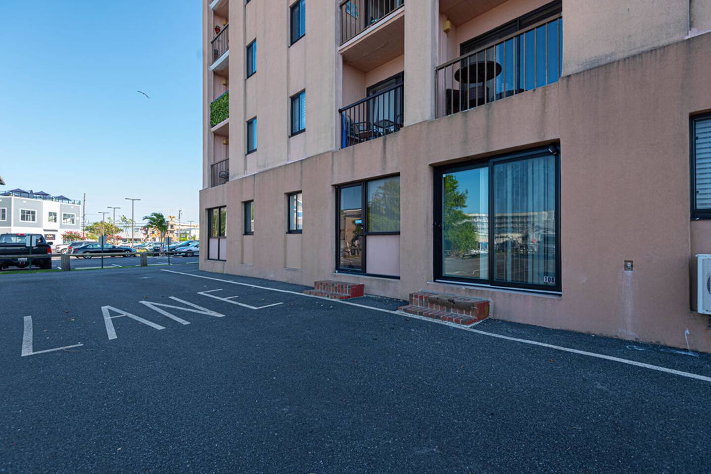 Condo is on the ground floor with no stairs and there is plenty of unmarked parking spots on site. There is an outdoor community space by the canal that has a picnic table, grass, and a dock. There is also an outdoor hose to rinse off on the side of the building.